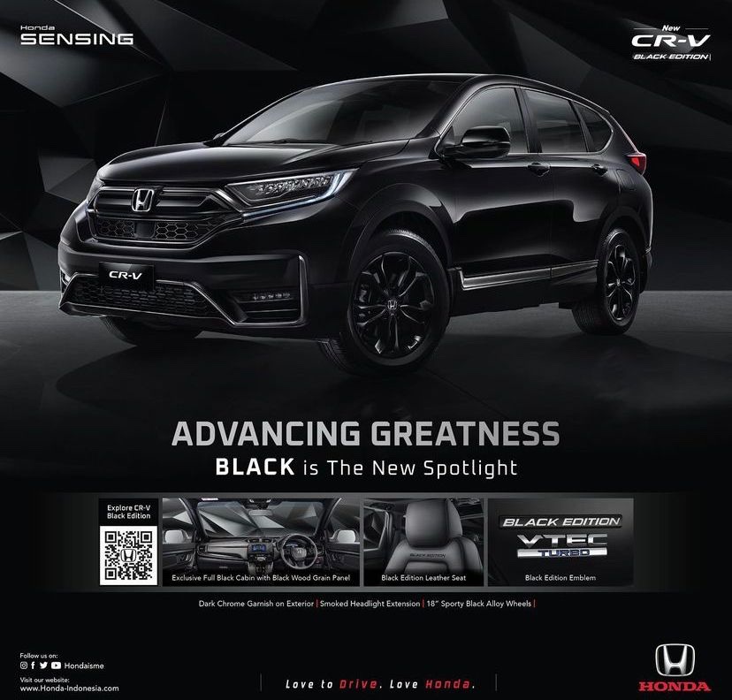 Jadilah pusat perhatian setiap kali anda berkendara bersama honda CRV BLACK EDITION yang hadir dengan desain semakin tangguh dan stylish dengan warna Crystal Black Pearl.